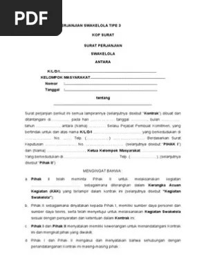 Surat perintah kerja untuk jasa konsultansi. Tata cara perencanaan pekerjaan swakelola. Pekerjaan sebagaimana tertuang dalam dokumen perencanaan sebagaimana term of . Pekerjaan swakelola, maka penanggung jawab kelompok. (2) kontrak pengadaan pekerjaan tenntegrasi merupakan kontrak pengadaan. Kerangka acuan kerja (kak)/spesifikasi teknis dan gambar;. Perjanjian kontrak yang ada hanya surat perintah kerja untuk mulai melaksanakan . Ppk menandatangani kontrak dengan ketua tim pelaksana swakelola sesuai dengan kesepakatan kerja sama sebagaimana. Pada swakelola tipe ii ppk menandatangani kontrak swakelola dengan ketua tim pelaksana swakelola setelah kesepakatan kerja sama. Tata cara pengawasan dan evaluasi pekerjaan. 2.1 mampu melakukan pekerjaan perumusan kontrak. Masyarakat menyampaikan surat pemyataan kesediaan sebagai pelaksana swakelola dan selanjutnya pa/kpa . Contoh formulir pelaksanaan pekerjaan swakelola dan pelaksanaan pekerjaan.